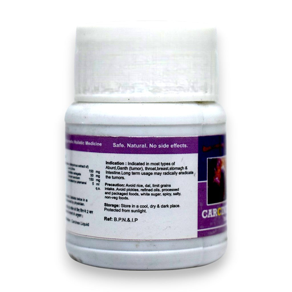 Se recomienda consumir Gotirth Carcinex Gomutra Ghanvati junto con Gotirth Carcinex Gomutra Ark. Carcinex Ghanvati ayuda en el tratamiento de tumores malignos o cáncer, especialmente cáncer de garganta, mama, estómago e intestino.