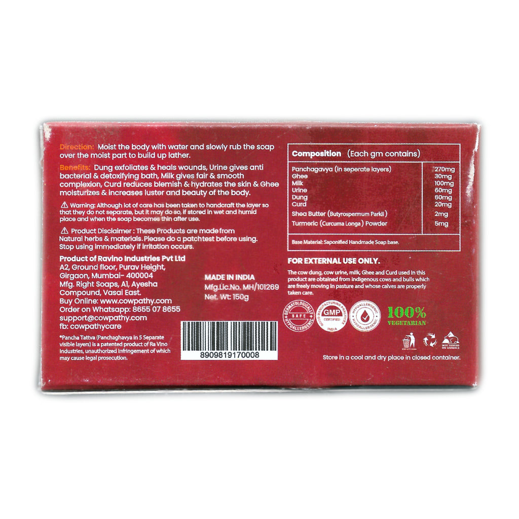 यह उत्पाद एक अद्वितीय रंग-रहित, हस्तनिर्मित सूत्रीकरण है जिसमें पांच परतें हैं शुद्ध भारतीय देशी A2 गाय के गोबर, दूध से बना पंचगव्य साबुन, घी, दही और आसुत मूत्र से बना यह साबुन सल्फेट, पैराबेन और जीएमओ मुक्त है।