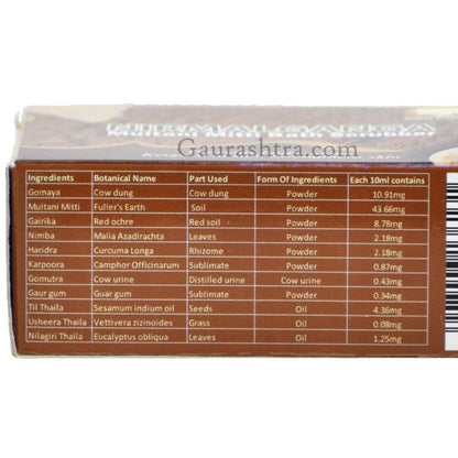 मुल्तानी मिट्टी (43.66 मिलीग्राम), गोमय (गाय का गोबर, 10.91 मिलीग्राम), गैरिका, निंबा (नीम), हरिद्रा (हल्दी), कर्पूरम, गोमूत्र, तिल का तेल, उशीरा तेल, नीलगिरी तेल, और गौर गोंद जैसे प्राकृतिक बाइंडर्स।