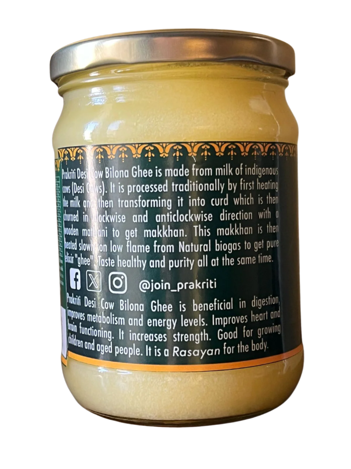 Experience the nourishing essence of Prakriti A2 Desi Cow Bilona Ghee, a premium-grade ghee made using milk from native Indian breeds like Sahiwal and Haryana cows. Prepared through the Vedic Bilona method, this nutrient-rich ghee balances Vata and Pitta doshas while enhancing digestion, immunity, and vitality.